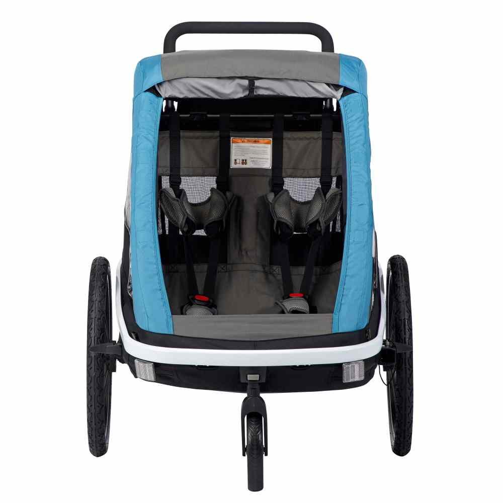 Remorque à vélo stable et polyvalente, transformable en poussette, pour 2 enfants à partir de 6 mois.