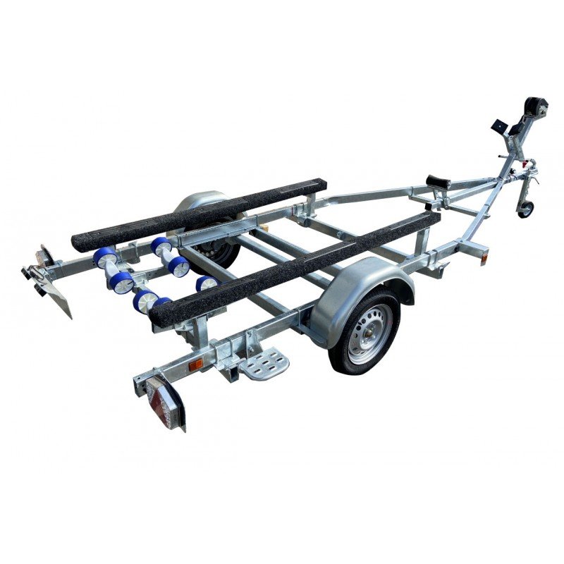 Remorque Sunway G510PT19 idéale pour tous les bass boats alu ou fibre, réalisée avec un rouleau » d’attaque » sur l’arrière et de 2 supports moquettés de grande longueur assurant une surface de contact importante entre la barque et ce support, évitant ainsi toutes les déformations de coques qu’engendrent d’autres systèmes.